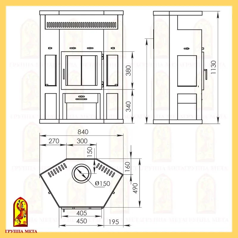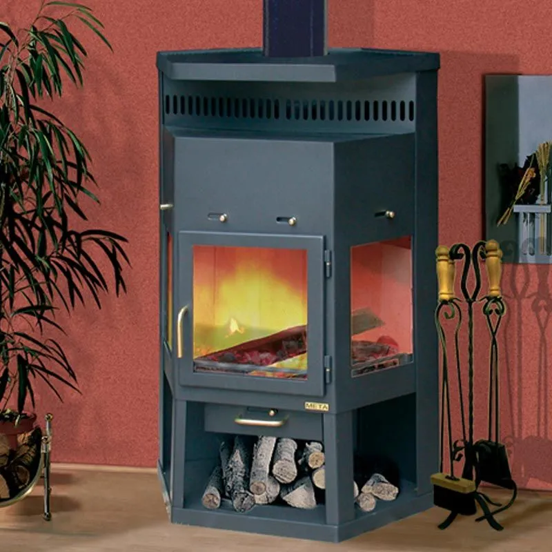 Пристенно-угловая модель с универсальным подключением дымохода (заднее и верхнее). Предназначен для отопления помещений объемом до 220 куб.м. Топочная камера выложена шамотной плиткой, в случае повреждения каждая плитка легко заменяется. «Енисей» из всех моделей группы «Мета» имеет максимальное остекление ─ стеклянные боковые окна и распашная дверка — все из прозрачного жароустойчивого стекла.