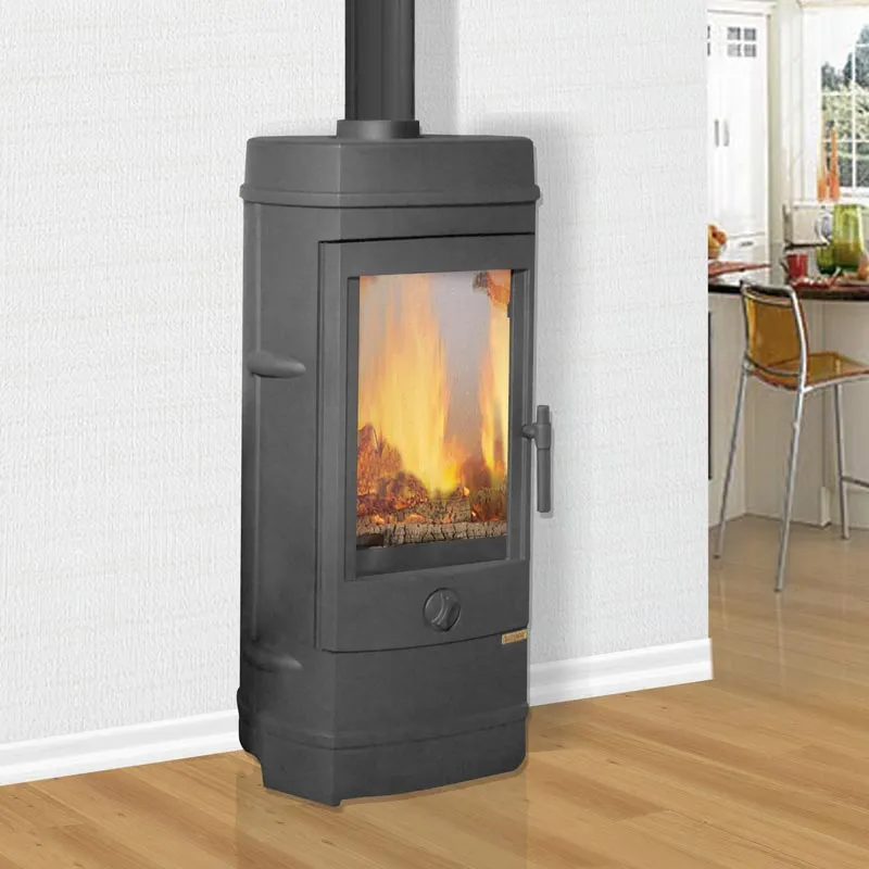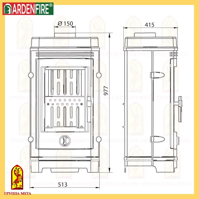 Печь-камин изготовлен из высококачественного чугуна и окрашен черной жаропрочной краской. Предназначен для отопления помещения объемом до 200 куб.м. Топка выложена шамотной огнеупорной плиткой. Имеется система «чистое стекло». Дверца снабжена специальным термостойким стеклом (стеклокерамикой Neoceram N-O производства Японии). Для уплотнения разъёмных элементов печей используется специальный шнур. Подключение дымохода верхнее