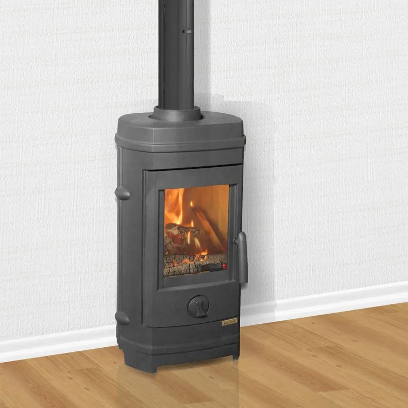 Печь-камин изготовлен из высококачественного чугуна и окрашен черной жаропрочной краской. Предназначен для отопления помещения объемом до 140 куб.м. Топка выложена шамотной огнеупорной плиткой. Имеется система «чистое стекло». Дверца снабжена специальным термостойким стеклом (стеклокерамикой Neoceram N-O производства Японии). Для уплотнения разъёмных элементов печей используется специальный шнур. Подключение дымохода верхнее