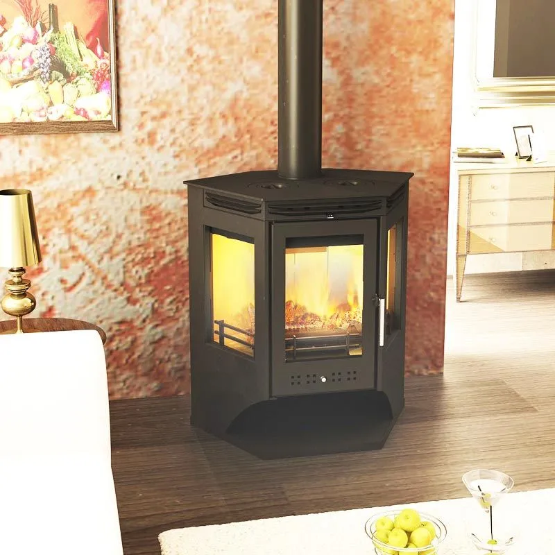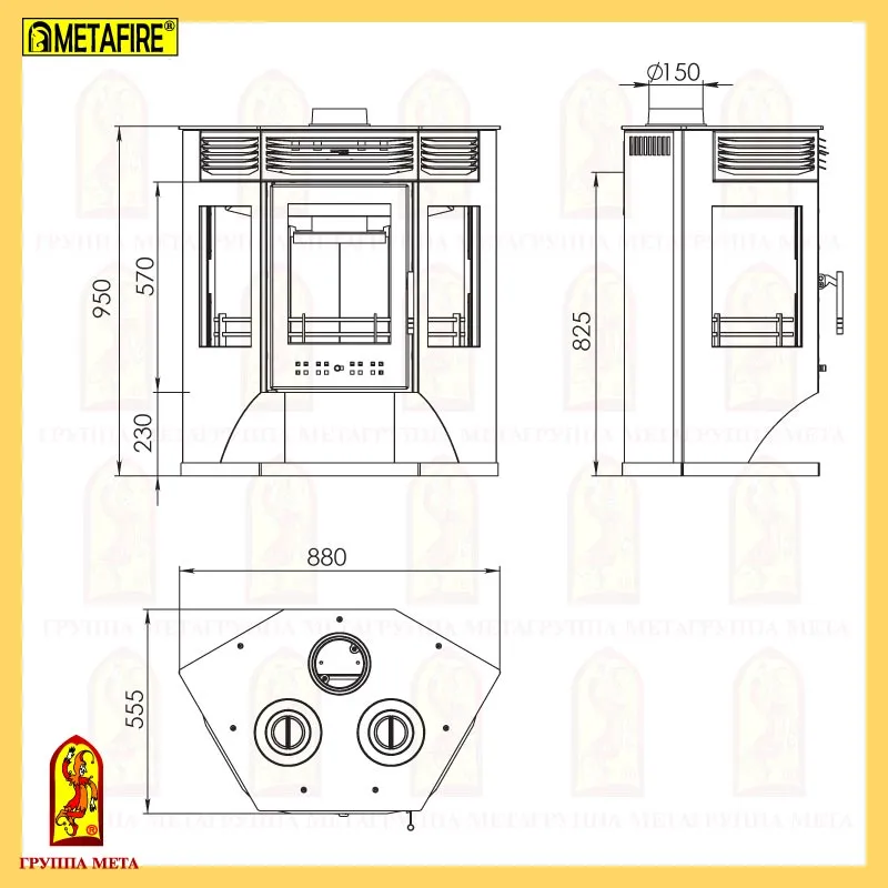 Дровяной печь-камин предназначен для отопления помещений объемом до 240 куб.м. Топочная камера выложена шамотной плиткой, в случае повреждения каждая плитка легко заменяется. Система «чистое стекло» обеспечивает защиту стекла от оседания копоти. Предусмотрена система «длительное горение» Плита стальная (толщина 8 мм), с двумя конфорками и заглушкой для установки патрубка дымохода. Когда дымоход выведен назад, заглушка может использоваться как дополнительная конфорка. Термостойкие стекла: 400x295 - 3шт. Подключение дымохода: верхнее, заднее.