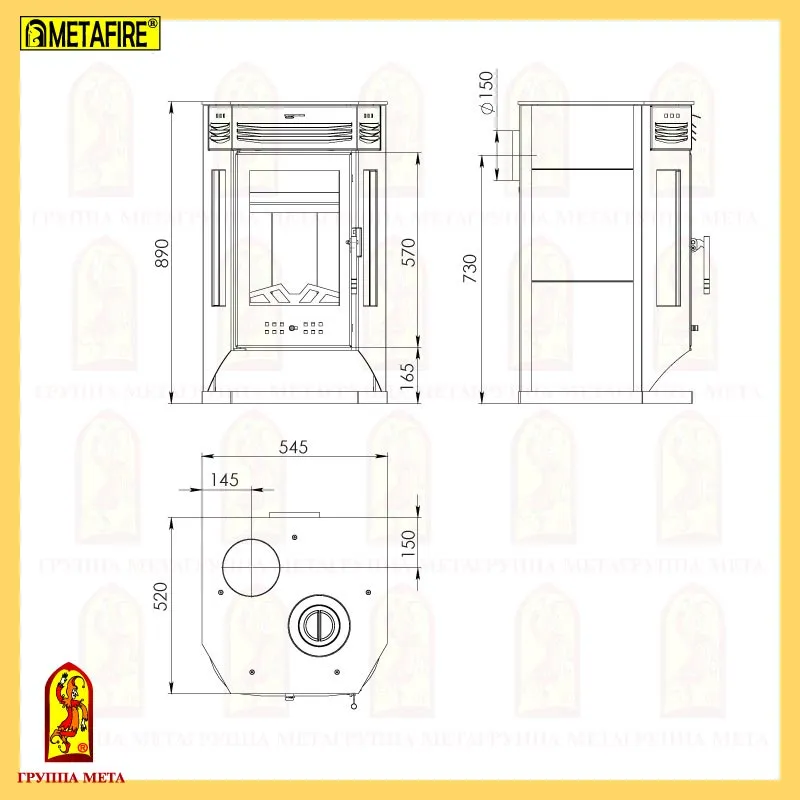 Дровяной печь-камин предназначен для отопления помещений объемом до 180 куб.м. Топочная камера выложена шамотной плиткой, в случае повреждения каждая плитка легко заменяется. Система «чистое стекло» обеспечивает защиту стекла от оседания копоти. Предусмотрена система «длительное горение» Плита стальная (толщина 8 мм), с двумя конфорками и заглушкой для установки патрубка дымохода. Когда дымоход выведен назад, заглушка может использоваться как дополнительная конфорка. Подключение дымохода: верхнее, заднее. Термостойкие стекла: 416х280 - 1 шт., 416х94 - 2 шт.