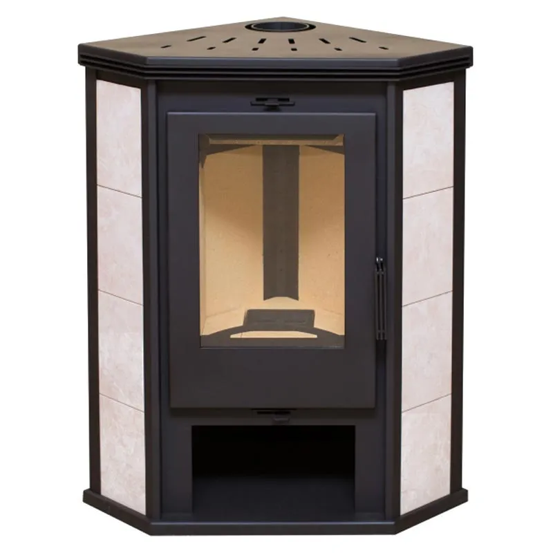 Компактная угловая печь с диаметром дымоходного патрубка 115 мм. Печь оснащена системой «регулируемого вторичного дожига». Дополнительная конвекция предусмотрена на верхней крышке печи. Идеально подходит для обогрева небольшого загородного домика площадью 30-60 м2. Размер поленьев 25 -27 см. Подсоединение к дымоходу сверху.