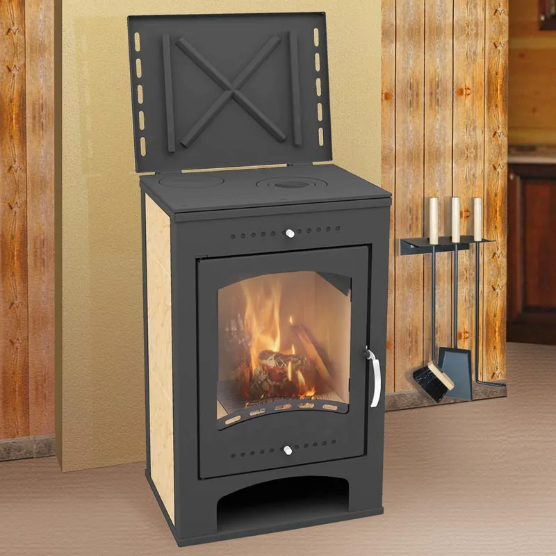 Пристенная модель с универсальным подключением дымохода (заднее и верхнее). Объем отапливаемого помещения до 260 куб.м. Топочная камера выложена шамотной плиткой, в случае повреждения каждая плитка легко заменяется. Большая чугунная плита с одной конфоркой для приготовления пищи. Встроенный теплообменник выполнен из высококачественной стали толщиной 5 мм. Печи-камины Аква возможно топить неподключенными к системе отопления, при этом теплообменник из строя не выйдет. Однако это ускоряет его износ