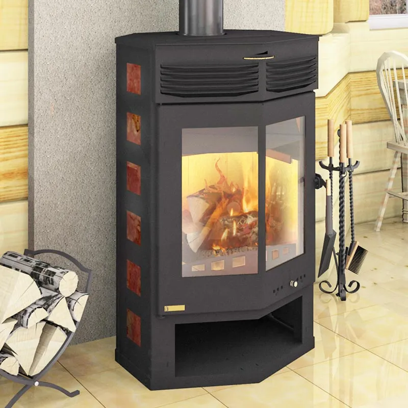 Пристенная модель с универсальным подключением дымохода (заднее и верхнее). Объем отапливаемого помещения до 180 куб.м. Топочная камера выложена шамотной плиткой, в случае повреждения каждая плитка легко заменяется. Термостойкие стекла: 464х250 - 2 шт Системы «длительное горение» и «чистый огонь»