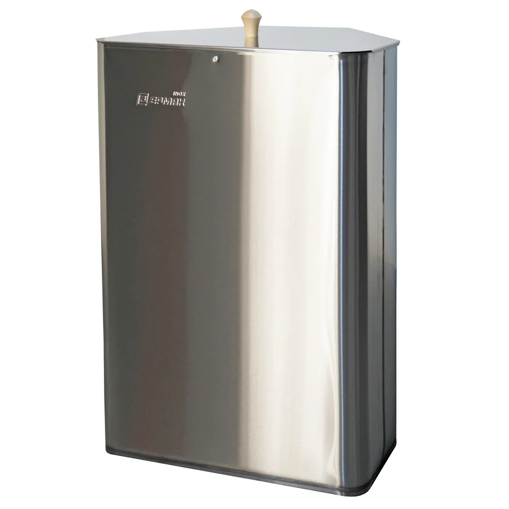 Угловой выносной бак Ермак INOX (65 литров) состоит из трех основных элементов - это корпус и дно, соединенные сваркой и крышка бака. Крышка бака имеет деревянную ручку. Бак имеет треугольную форму и может легко размещаться в углу помещения.