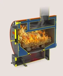 Эффективность теплообмена достигается благодаря развитой поверхности водяной рубашки и плоскому водоохлаждаемому козырьку, обеспечивающих теплосъём с всех поверхностей топки котла.