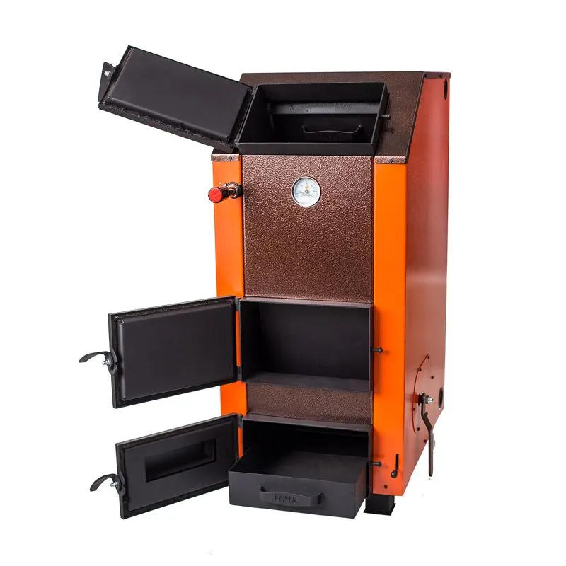 Твердотопливный котел длительного горения способный отопить помещение площадью 300 кв.м. Длительность горения при полной загрузке может достигать до 24 часов. Вид топлива – дрова, каменный уголь, угольные брикеты, бурый уголь. Данный котел можно оборудовать блоком ТЭНов с подключением пульта управления. В комплекте с котлом поставляется кочерга, регулятор тяги, шуровка, заглушки, термометр. Котел имеет выход дымохода прямоугольной формы, поэтому рекомендуется приобрести переходник с прямоугольного сечения на круглый диаметр 150 мм. Комфортный процесс удаления золы и отходов горения твердого топлива без остановки его деятельности. Водонаполненный колосник, позволяющий увеличить скорость нагрева воды в системе и предотвращающий износ внутренних узлов котла. В котле разработана уникальная система удаления крупной породы с использованием прочистных толкателей.