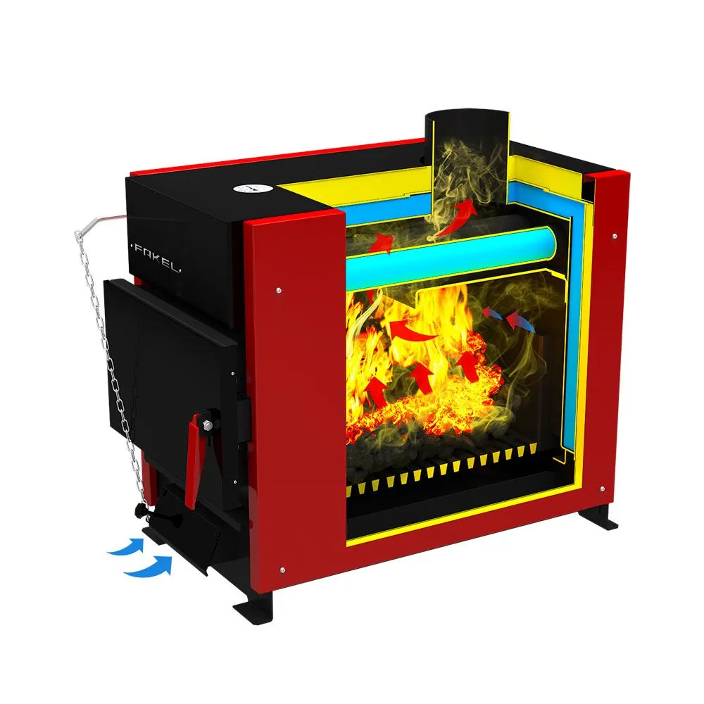 Стальной котел предназначен для отопления жилых домов до 100 кв.м., оборудованных системами водяного отопления с естественной или принудительной циркуляцией. Относится к разряду бюджетных котлов, который способен справиться с отоплением малых площадей. Основной вид топлива - ДРОВА, УГОЛЬ, БРИКЕТЫ. Круглое сечение дымохода на верхней части котла удобно при монтаже круглой трубу типа сэндвич. Наружные поверхности котла облицованы теплоизолирующим материалом, на основе базальтового волокна и защитно-декоративными панелями. Можно установить регулятор тяги на задней стенке котла (в комплект не входит)