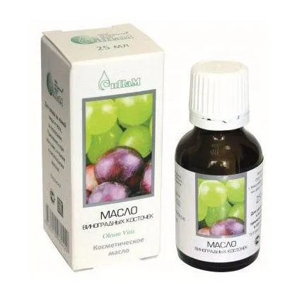 Это масло получают из косточек винограда после отжима сока и сушки. Высушенные косточки прессуются, экстрагируются, готовое масло рафинируется. Это очень легкое растительное масло, не имеющее запаха и обладающее консистенцией, позволяющей быстро впитываться в кожу. Содержит большое количество глицеридов ненасыщенных кислот - олеиновой, линолевой, витаминов, микроэлементов. Подходит для любого типа кожи, особенно полезно для жирной. Оказывает увлажняющее, регенерирующее и омолаживающее действие. Вяжущие свойства позволяют использовать это масло при лечении угревой сыпи. В смеси с миндальным маслом или маслом жожоба является прекрасным природным средством по уходу за кожей младенцев.