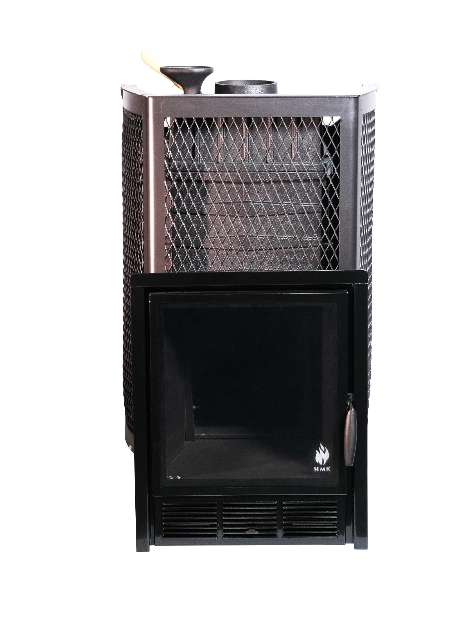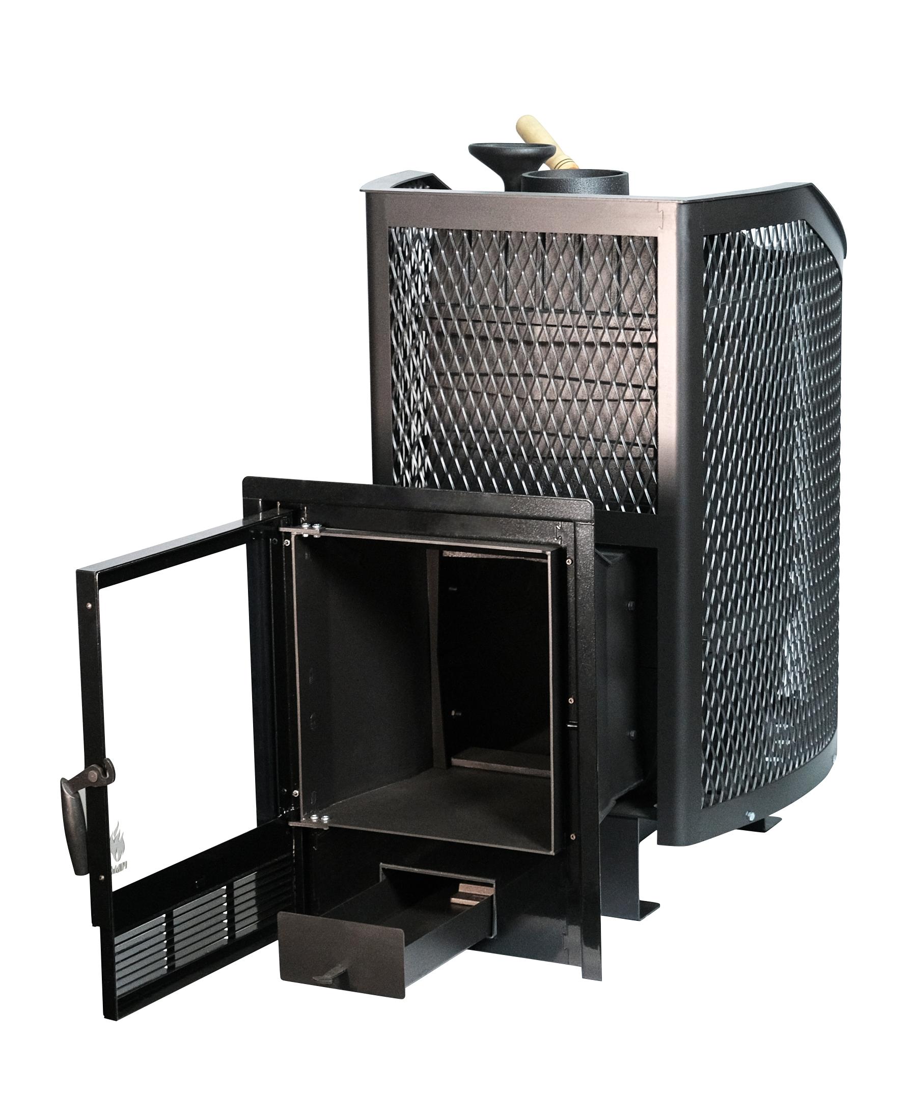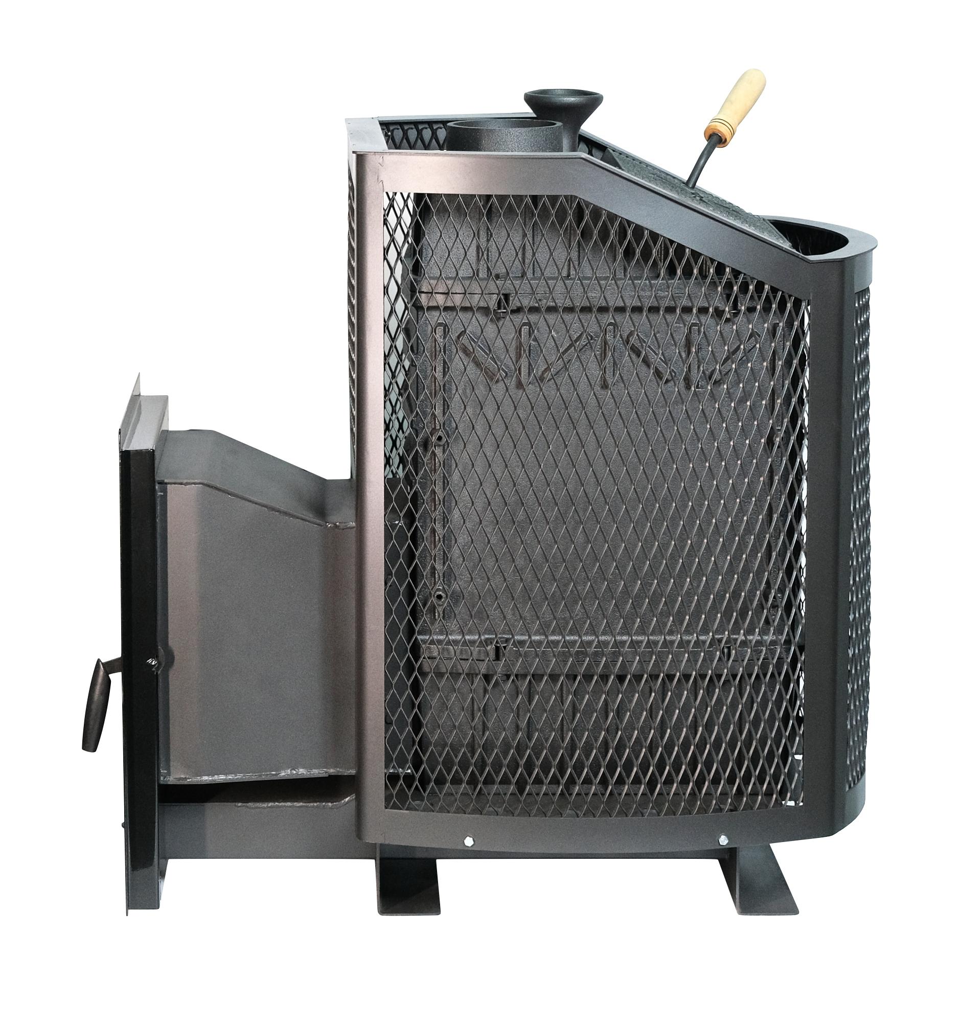 При этом закрытая каменка изготовлена из конструкционной нержавеющей стали толщиной 3 мм. Печь оснащена паровой пушкой для быстрой подачи воды непосредственно в закрытую каменку. Также можно лить воду на внешние камни открытой каменки.
