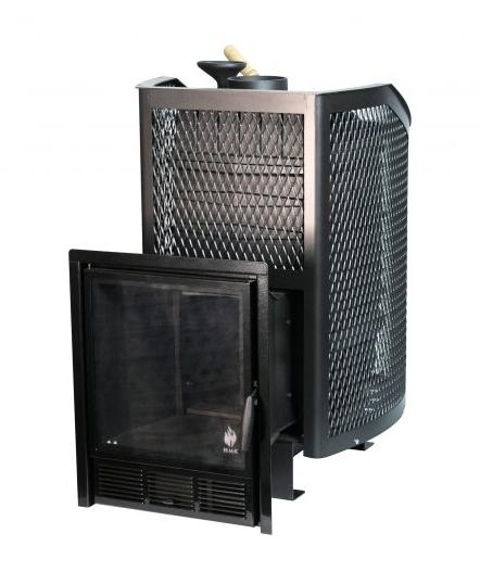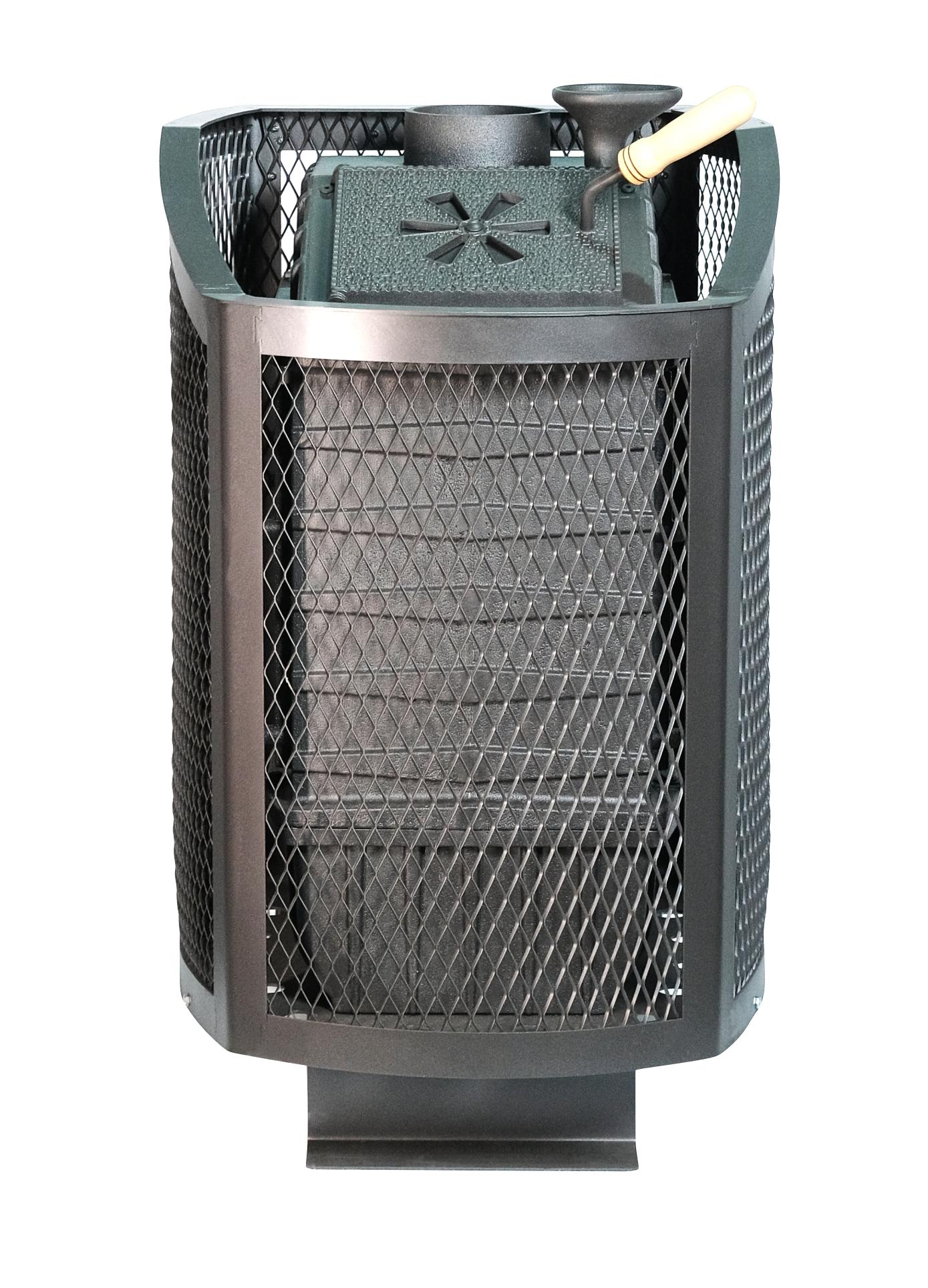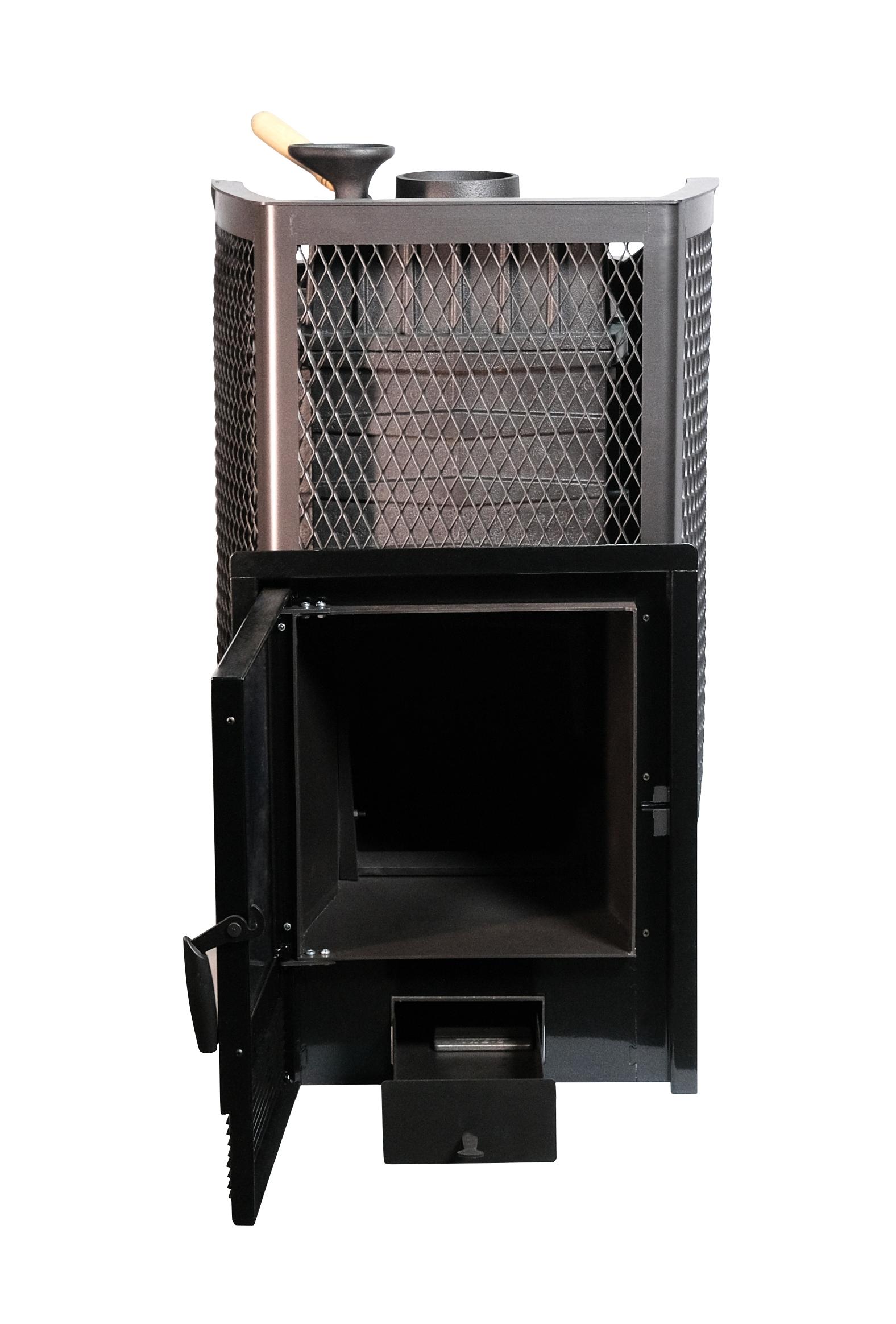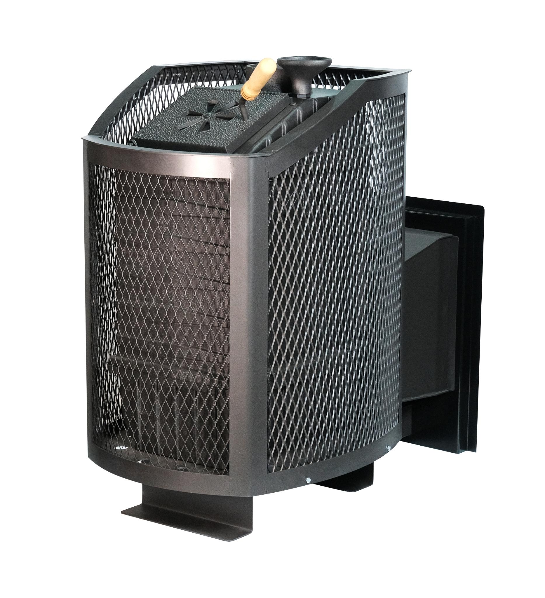 При этом закрытая каменка изготовлена из конструкционной нержавеющей стали толщиной 3 мм. Печь оснащена паровой пушкой для быстрой подачи воды непосредственно в закрытую каменку. Также можно лить воду на внешние камни открытой каменки.