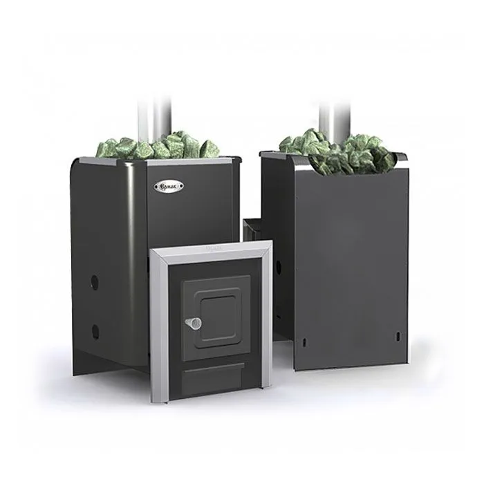Компактная печь для парных объемом 8-16 куб.м. Отличительная особенность - возможность изменять функциональность печи приобретая дополнительные опции: навесной бак, теплообменник, сетка-каменка, модуль закрытой каменки, парообразователь. Термические нагруженные элементы выполнены из стали толщиной 6 мм, корпус и система газоходов из стали 3-4 мм. В конструкции предусмотрено отверстие для чистки дымохода.