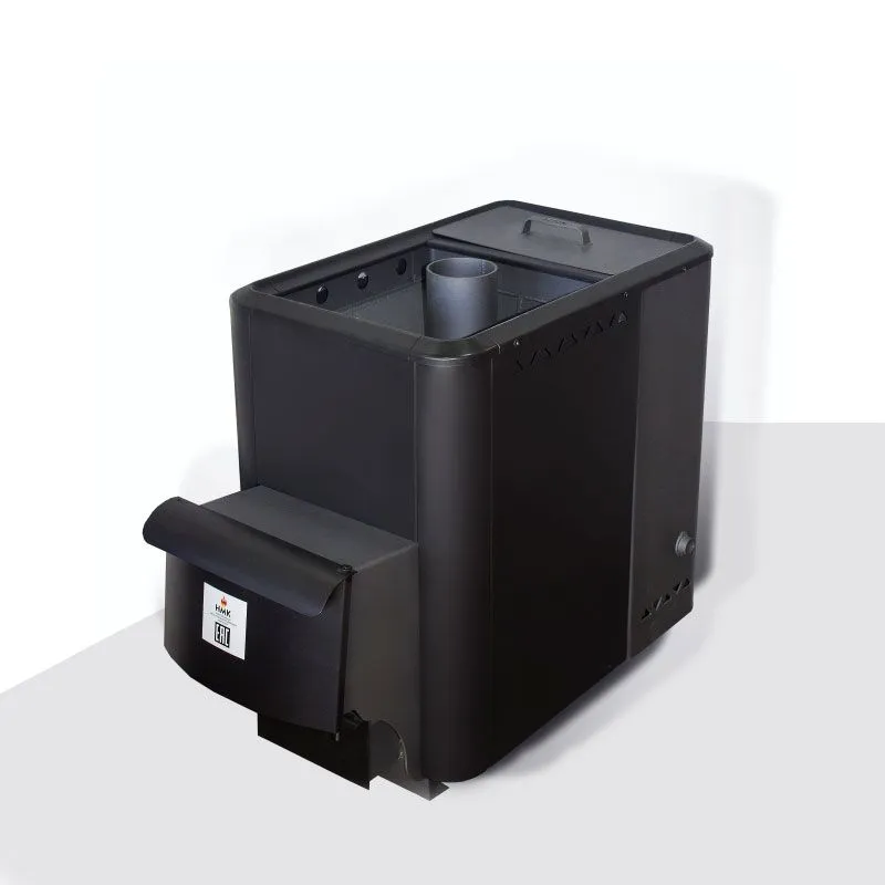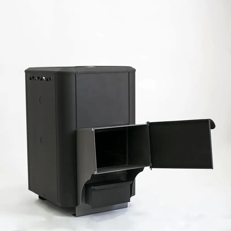 Предусмотрена выносная топка. Патрубок дымохода смещен вперед, для удобства размещения камней. В качестве дополнительного источника топлива можно использовать уголь. Расстояние от передней стенки печи до начала трубы 26 см.