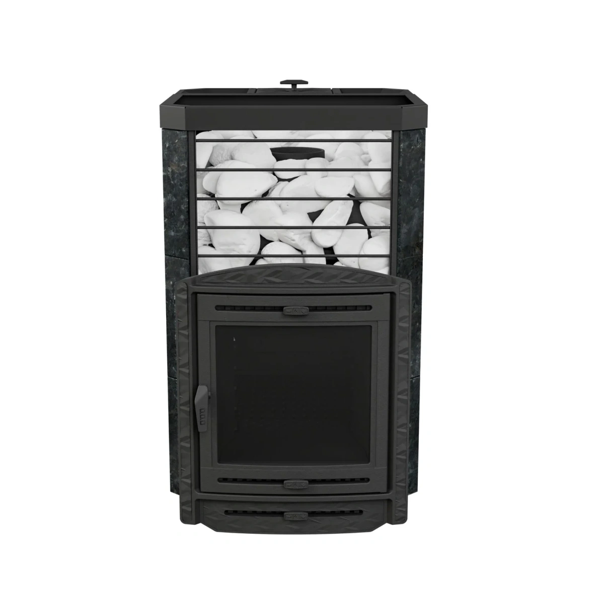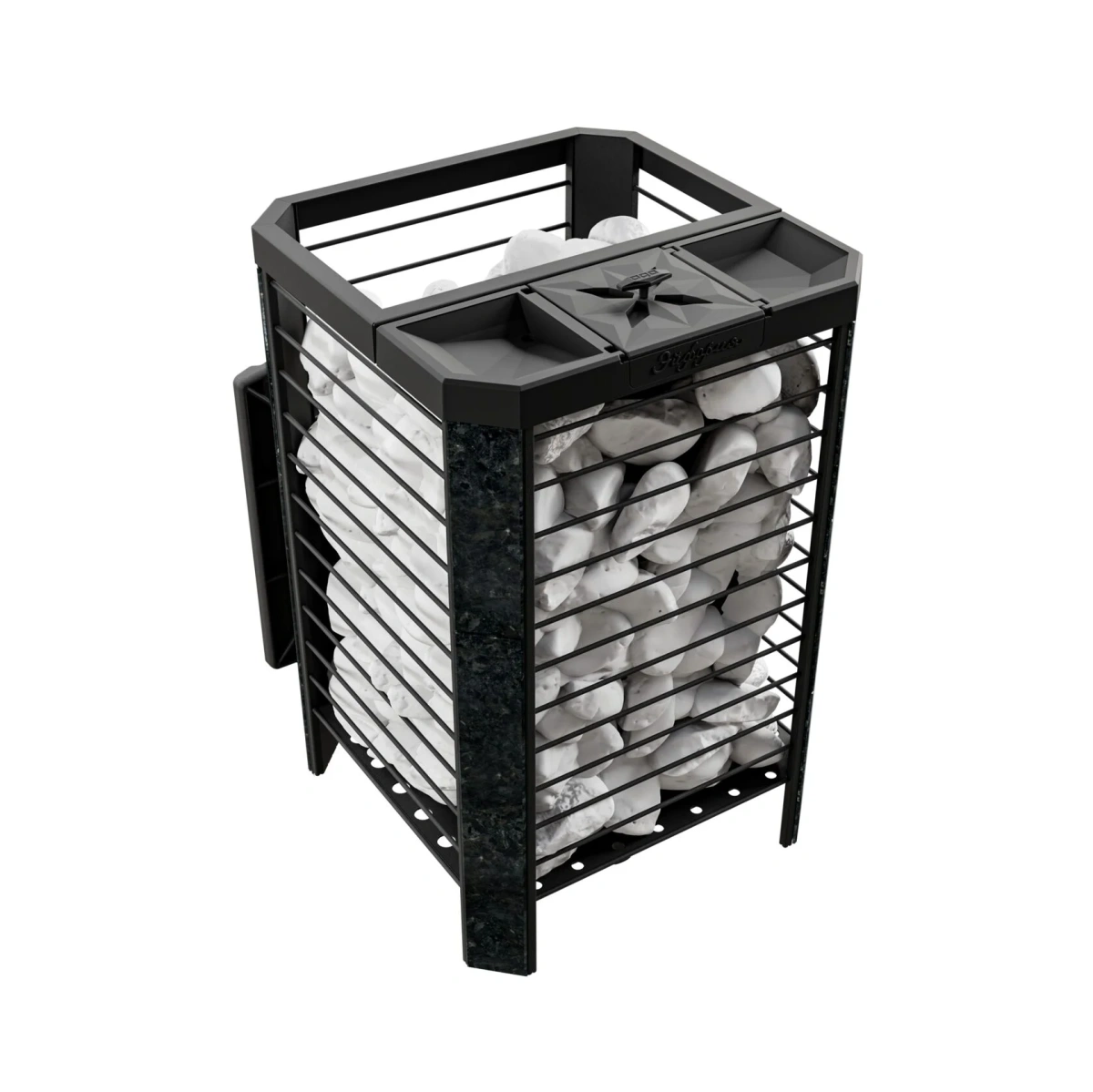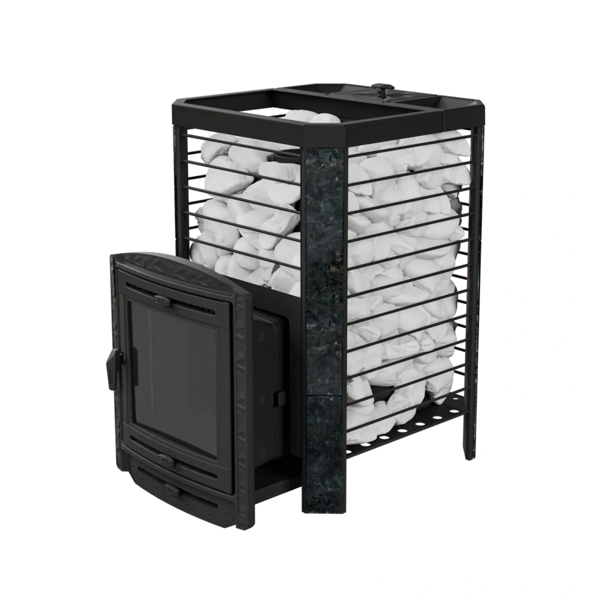 Модель повышенной мощности, обеспечит максимальное количество пара в больших помещениях. Кожух печи изготовлен в виде сетки из нержавеющей стали с прямоугольными ячейками и полностью заполняется природными камнями, обеспечивая высокую динамику нагрева парильного помещения.