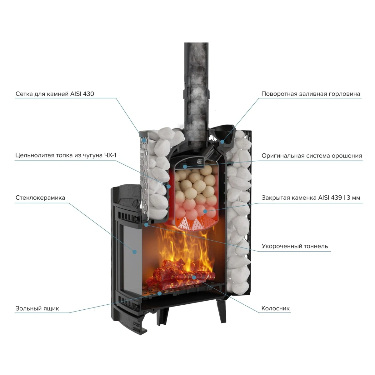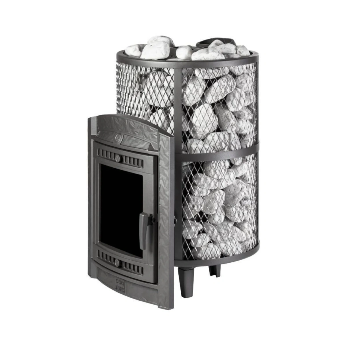 Компактная и экономичная модель с коротким топливным тоннелем. Кожух печи изготовлен в виде сетки из стали и полностью заполняется природными камнями, обеспечивая высокую динамику нагрева парильного помещения.