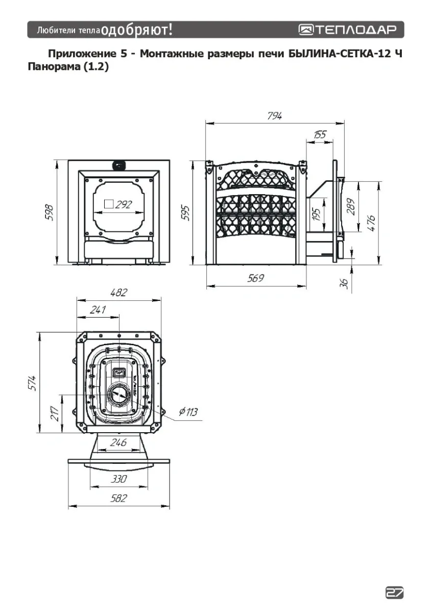 Печь для бани чугунная БЫЛИНА-СЕТКА-12Ч Панорама (1.2) Теплодар