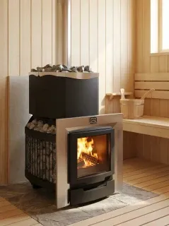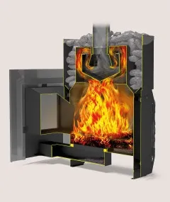 Каменка, оснащенная системой вентиляции, является источником постоянного пара. Вместе с ящиком для золы, действующим как регулятор горения, и колосником из чугуна, она обеспечивает стабильное и равномерное горение дров
