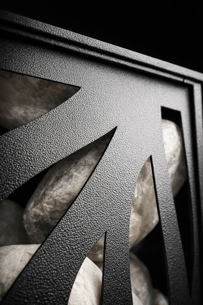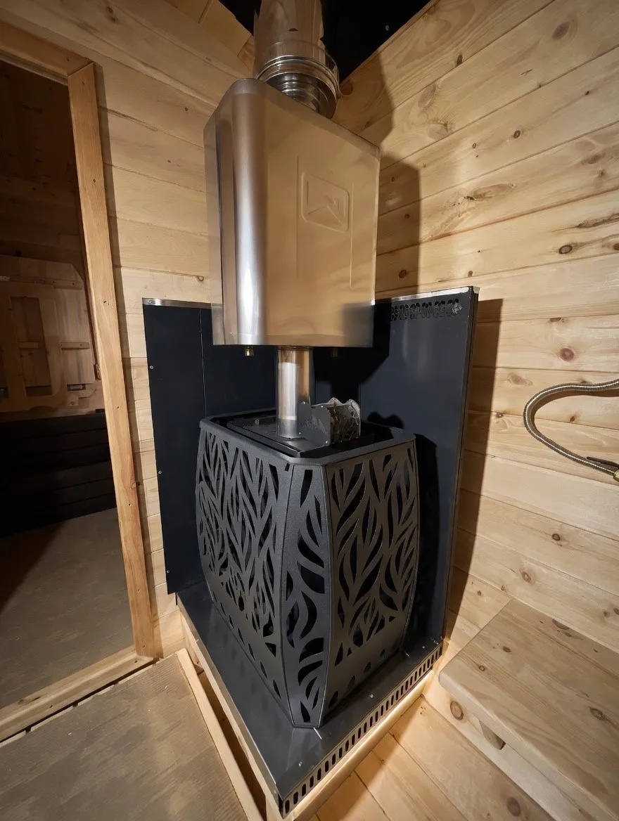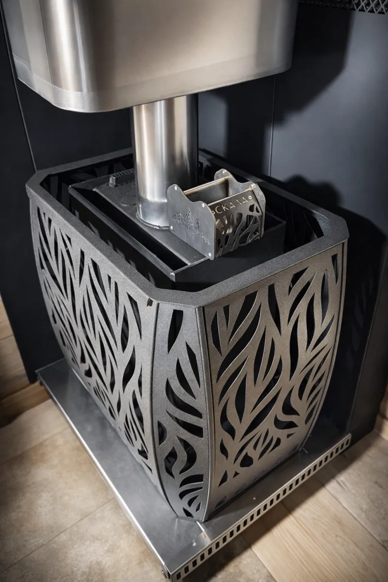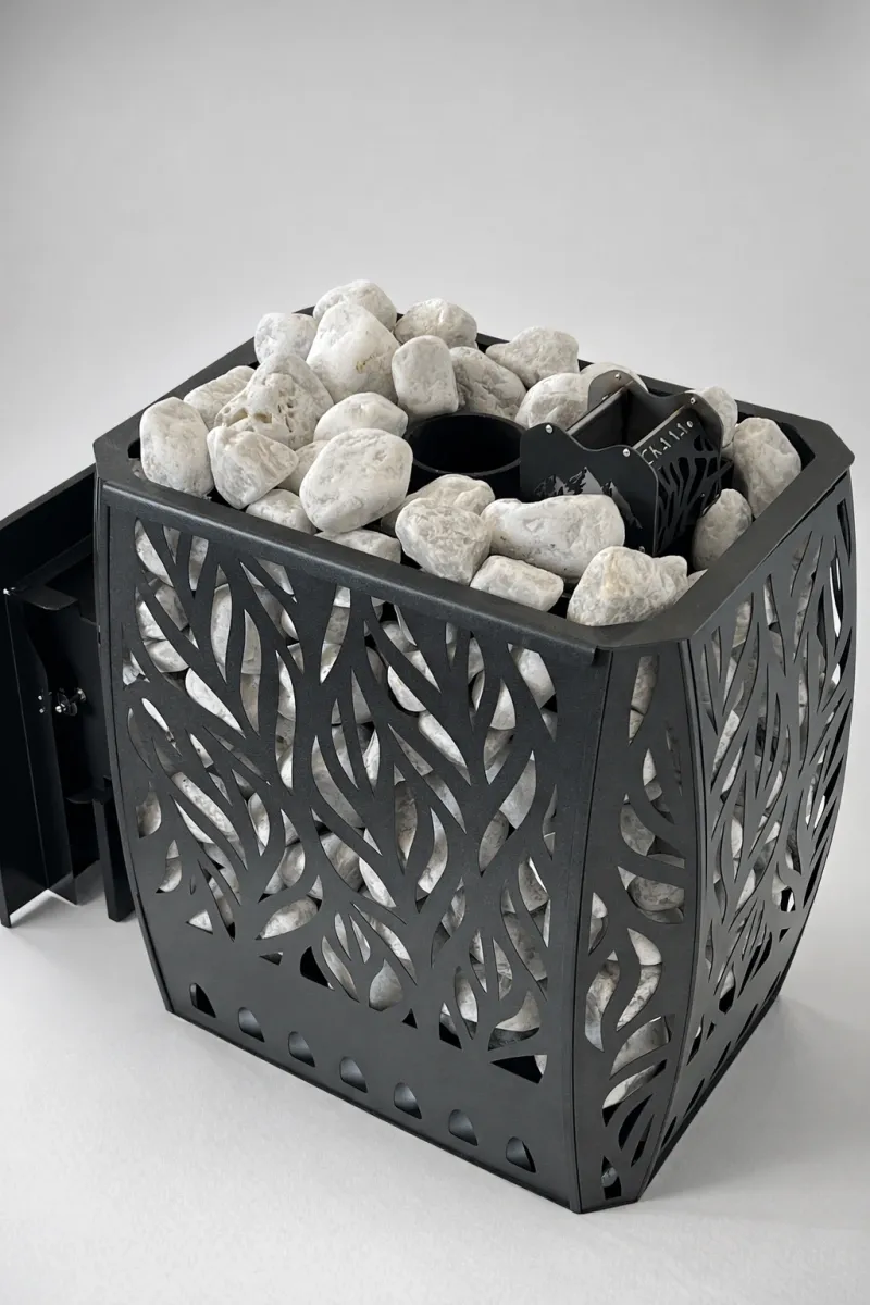 Стильная банная печь с премиальным дизайном: контрастная облицовка под камень, характерный для горной местности и ажурный кожух, в котором угадываются очертания растительных элементов, создают эффектный акцент в вашей бане.