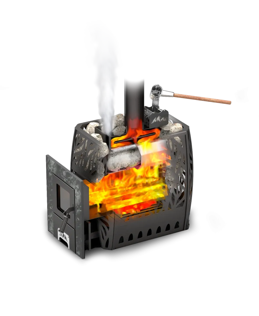 Каменка спроектирована так, чтобы не было “холодных зон”. Все камни прогреваются равномерно и работают одинаково эффективно. Это означает стабильную температуру, предсказуемый режим и качественный пар при каждом поддаче воды.