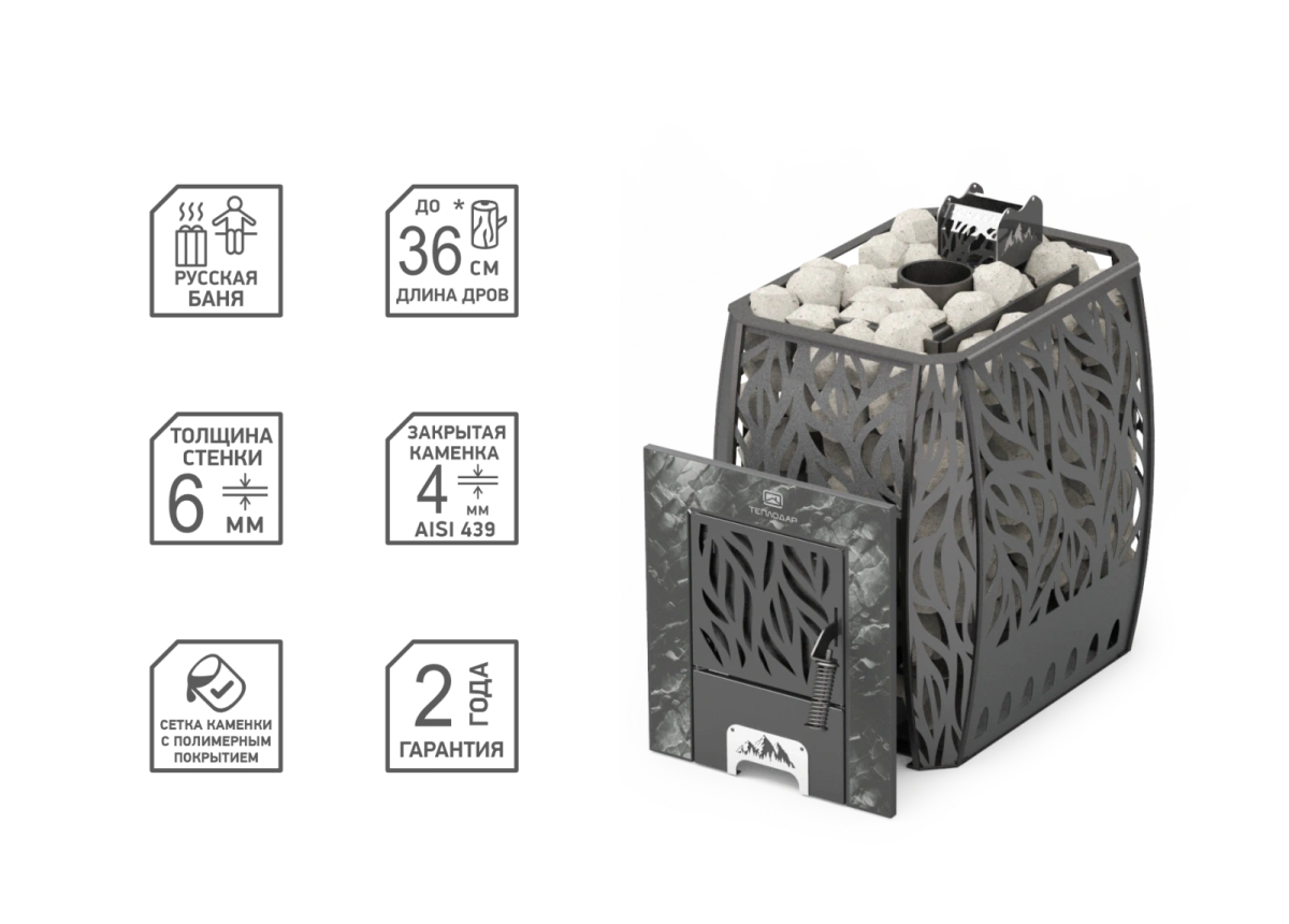 Печь рассчитана на внушительную массу камней: до 90 кг в сетке и до 15 кг во внутренней каменке. Большая закладка дает более мягкий и насыщенный пар, сохраняет тепло дольше и обеспечивает стабильный комфорт в парной.