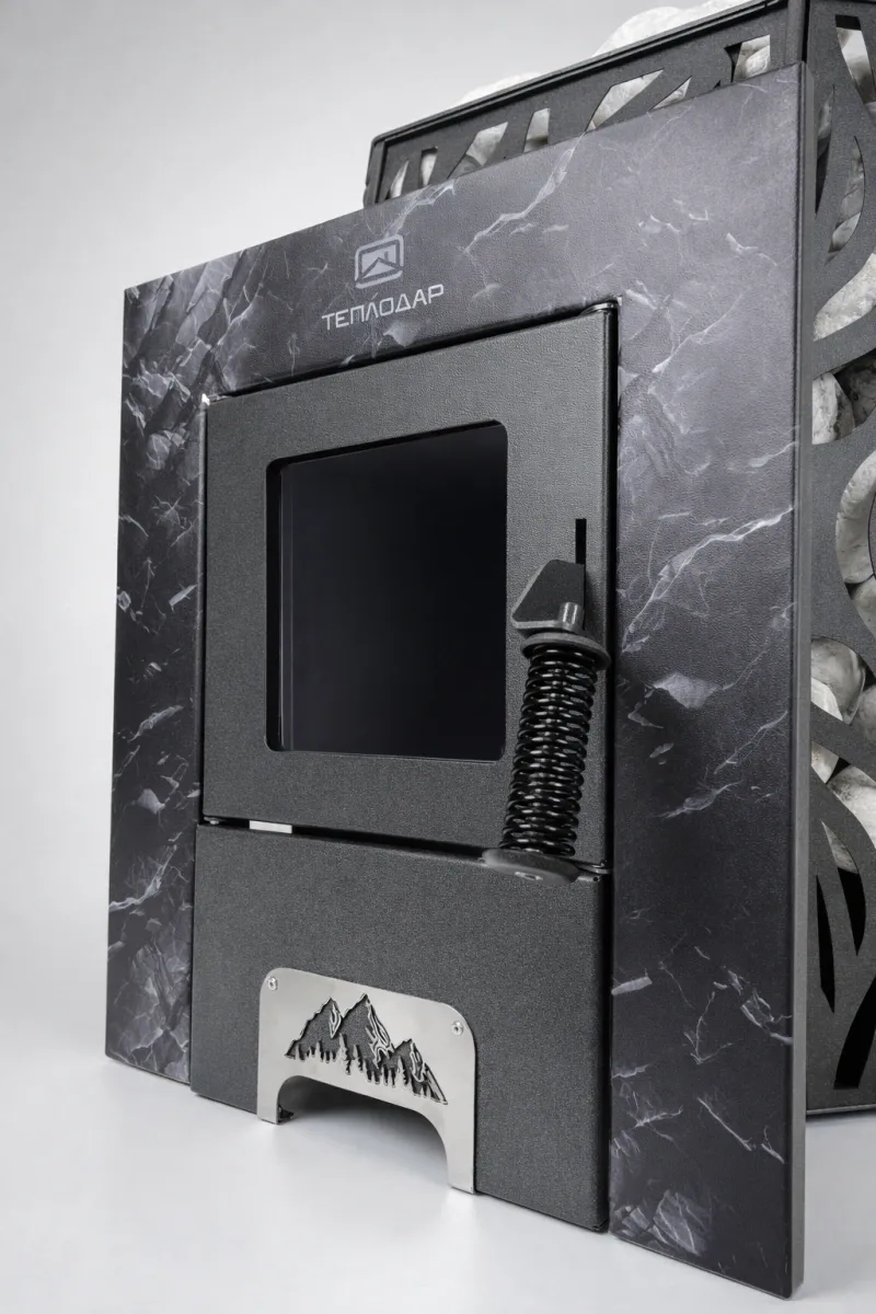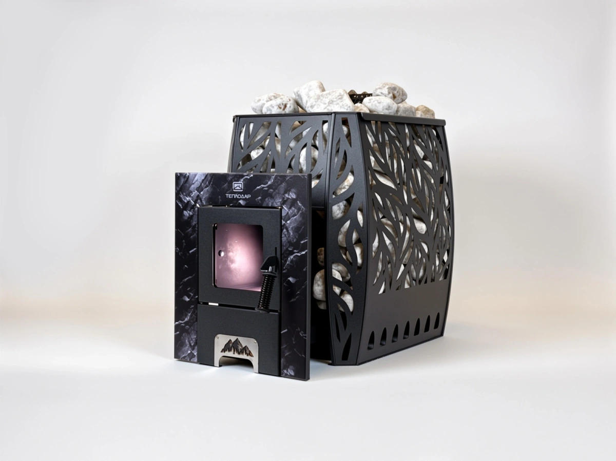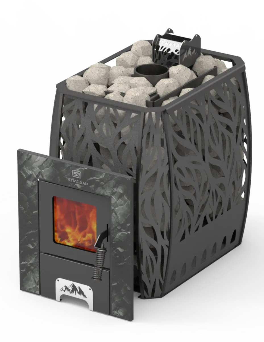 Стильная банная печь с премиальным дизайном: контрастная облицовка под камень, характерный для горной местности и ажурный кожух, в котором угадываются очертания растительных элементов, создают эффектный акцент в вашей бане.