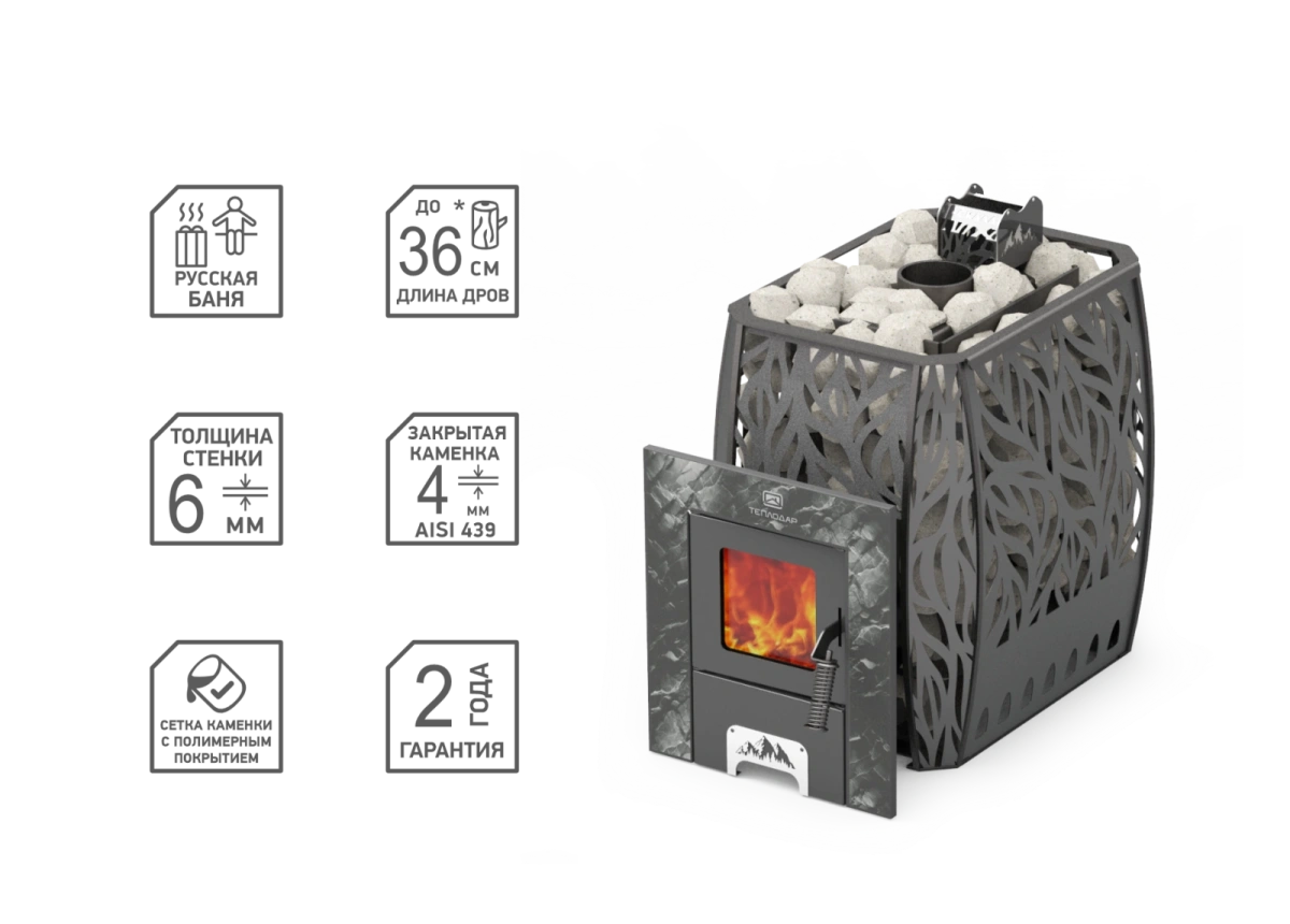 Печь рассчитана на внушительную массу камней: до 90 кг в сетке и до 15 кг во внутренней каменке. Большая закладка дает более мягкий и насыщенный пар, сохраняет тепло дольше и обеспечивает стабильный комфорт в парной.