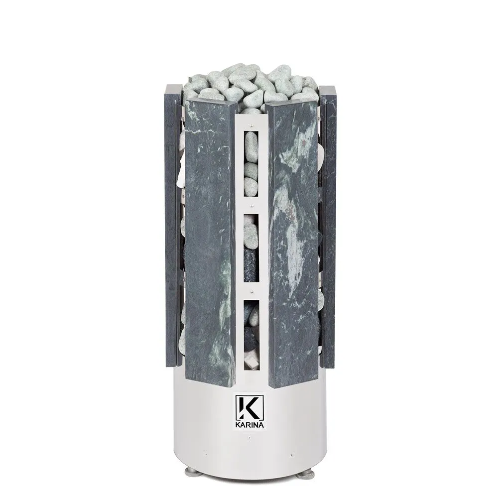 Электрокаменка Karina Forta имеет цилиндрическую форму дополненной плитами из натурального камня (змеевик -дороже или талькохлорит-дешевле).