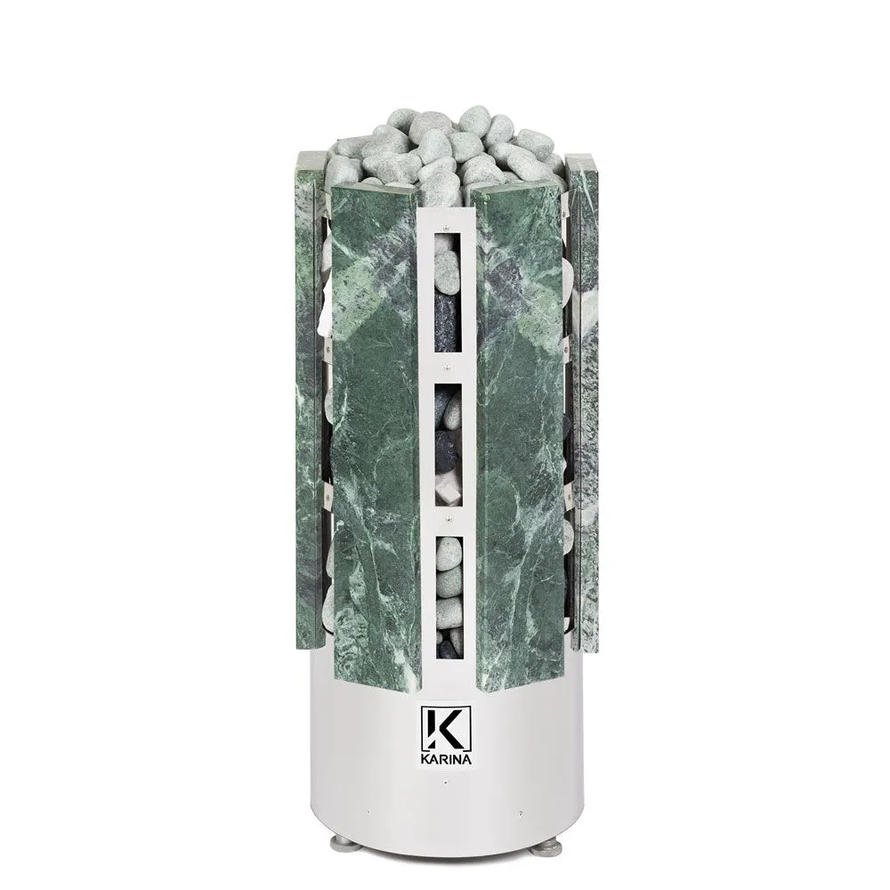 Электрокаменка Karina Forta имеет цилиндрическую форму дополненной плитами из натурального камня (змеевик -дороже или талькохлорит-дешевле).