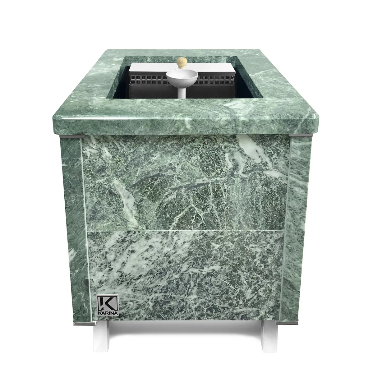 Электрическая печь KARINA Quadro В облицовке змеевик или талькохлорит – это электрокаменка, облицованная натуральным камнем со всех сторон, и обладающая мощностью оптимальной для домашних и небольших бань и саун от 1,5 квт до 18 квт или объемом сауны от 1,5 до 30 куб.м.