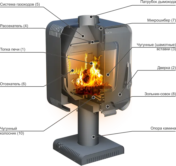 • Сложная система дымоходов - увеличивает КПД