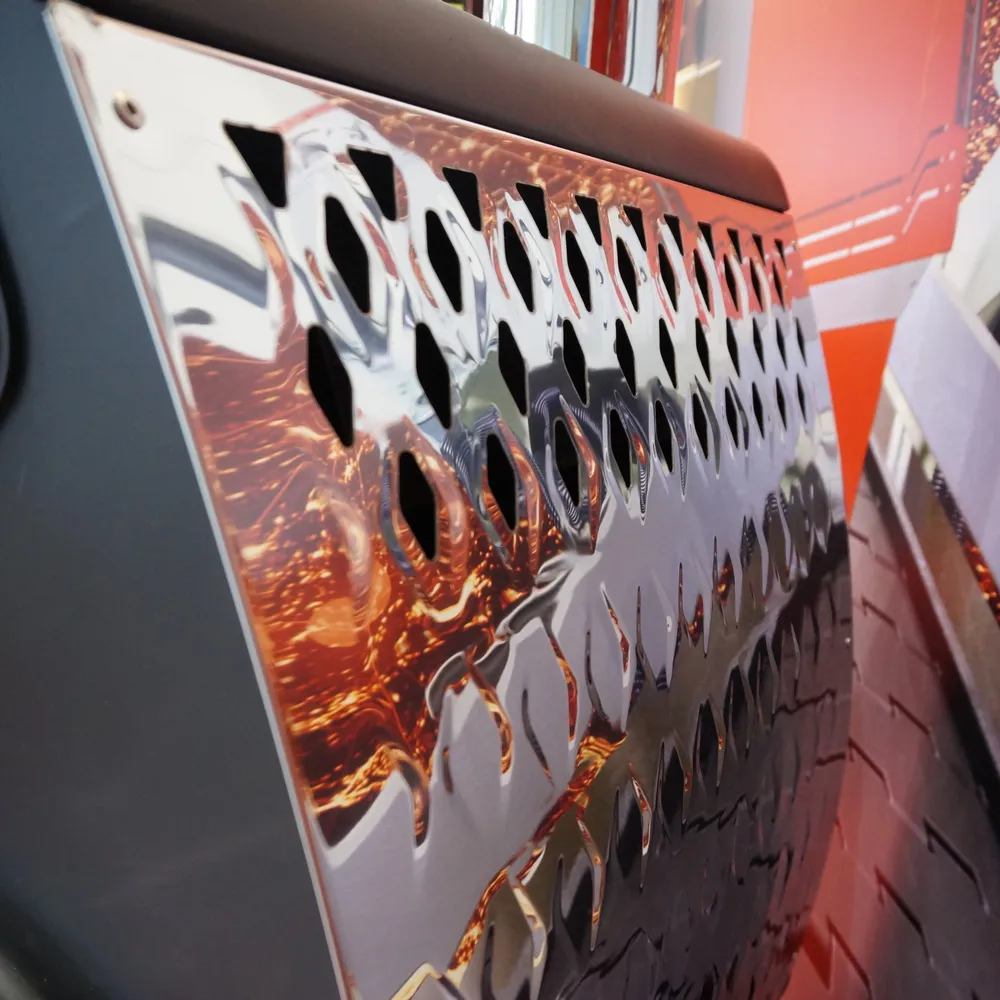 Защитный корпус печи обладает высоким конвективным эффектом, ускоряя прогрев помещения, а зеркальная поверхность конвектора отлично защищает от прямого инфракрасного излучения. Благодаря такому зеркальному конвектору из нержавеющей стали объекты и предметы, находящиеся с боков печи, не нагреваются.