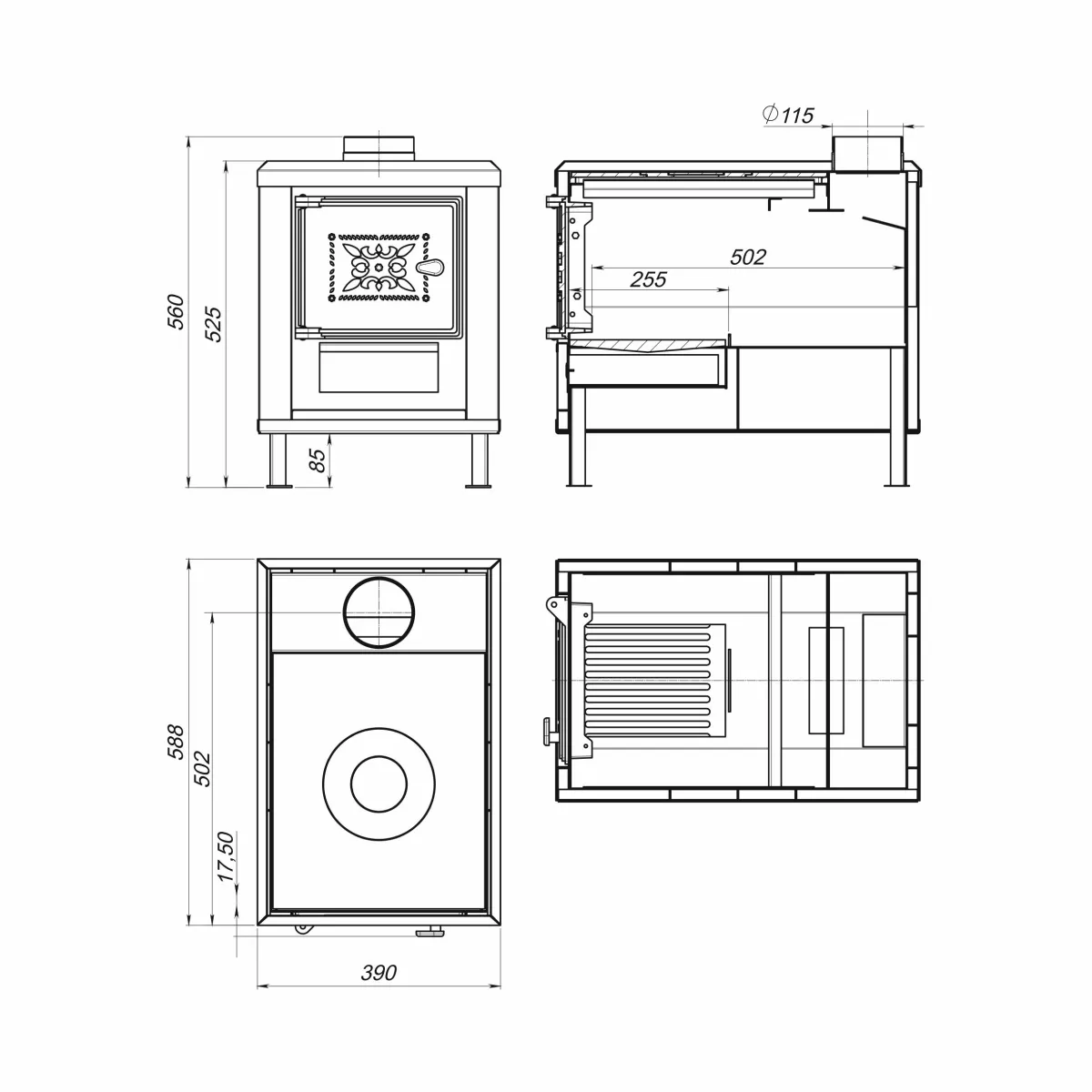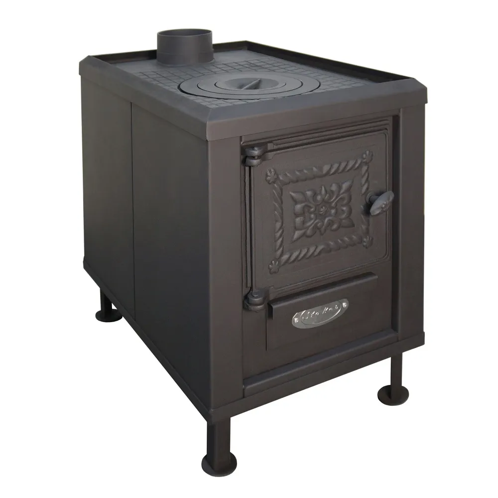 Печь обладает приличным объемом топки для закладки большого количества дров или брикетов для длительного горения и поддержания температуры. Варочная поверхность имеет съемные чугунные кольца для различных видов и размеров посуды.