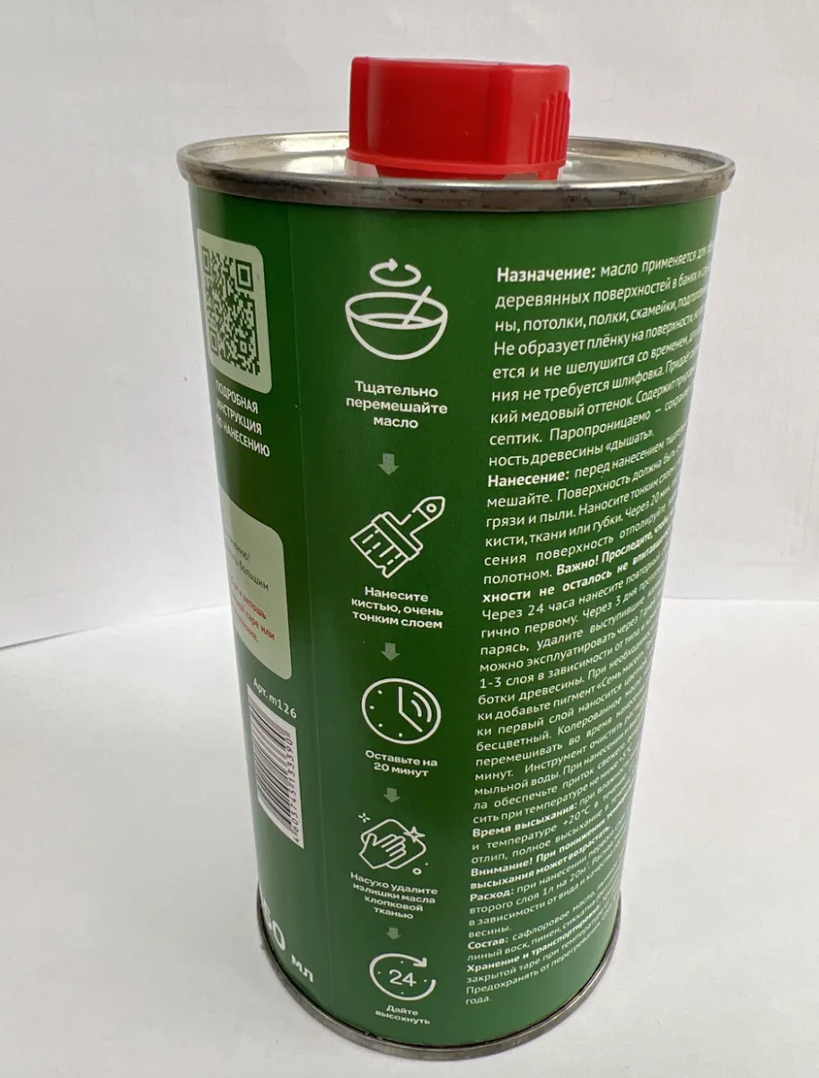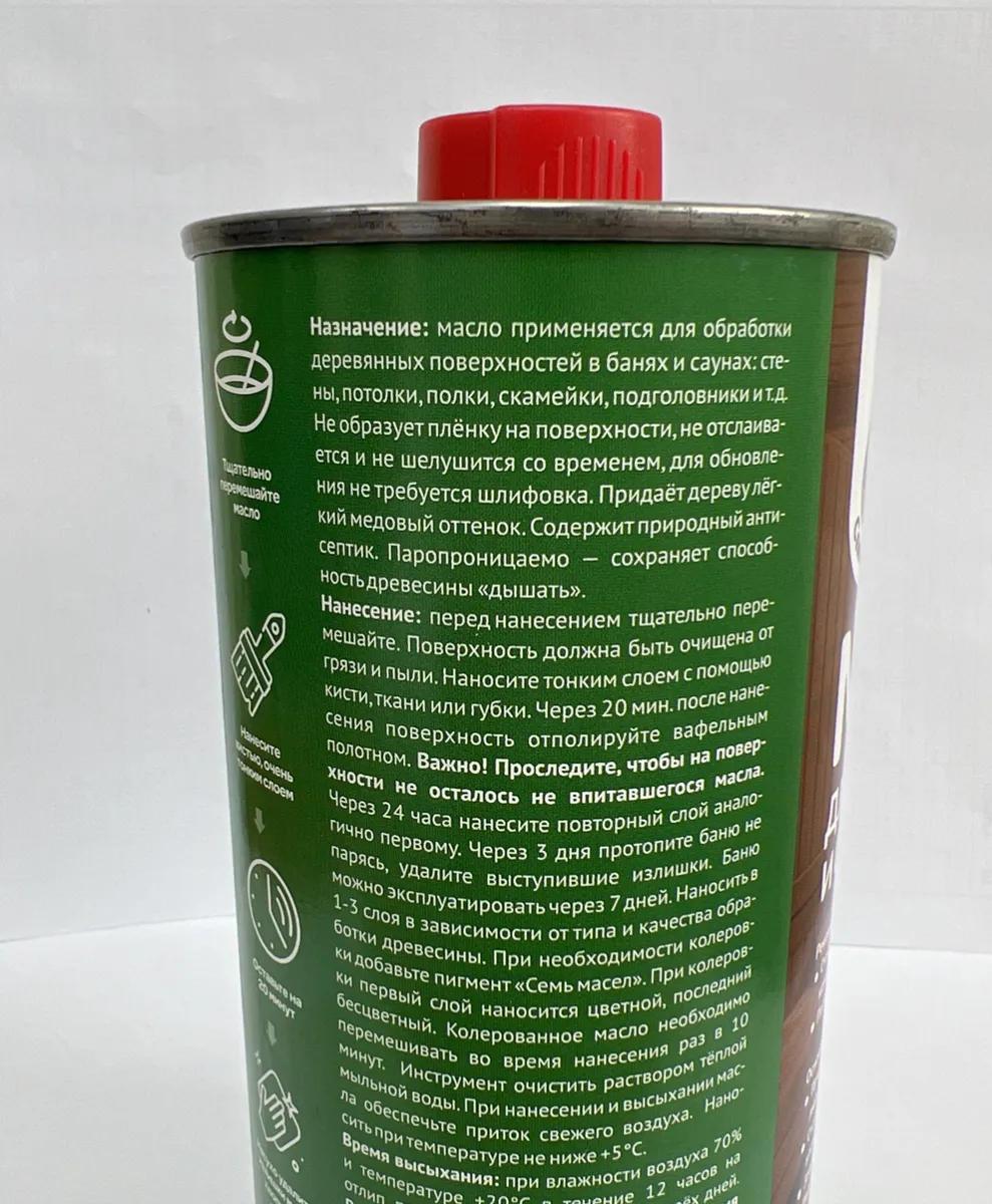 Баню можно эксплуатировать через 72 часа. Наносить в 1–2 слоя в зависимости от типа и качества обработки древесины. При необходимости колеровки добавьте пигмент «Семь масел». При колеровки первый слой наносится цветной, последний бесцветный. Колерованное масло необходимо перемешивать во время нанесения раз в 5–7 минут. Инструмент очистить раствором тёплой мыльной воды. При нанесении и высыхании масла обеспечьте приток свежего воздуха.