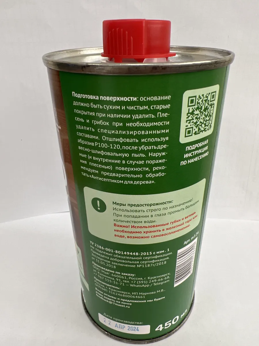 Состав: сафлоровое масло, льняное масло, пчелиный воск, пинен, сиккатив (без свинца).
