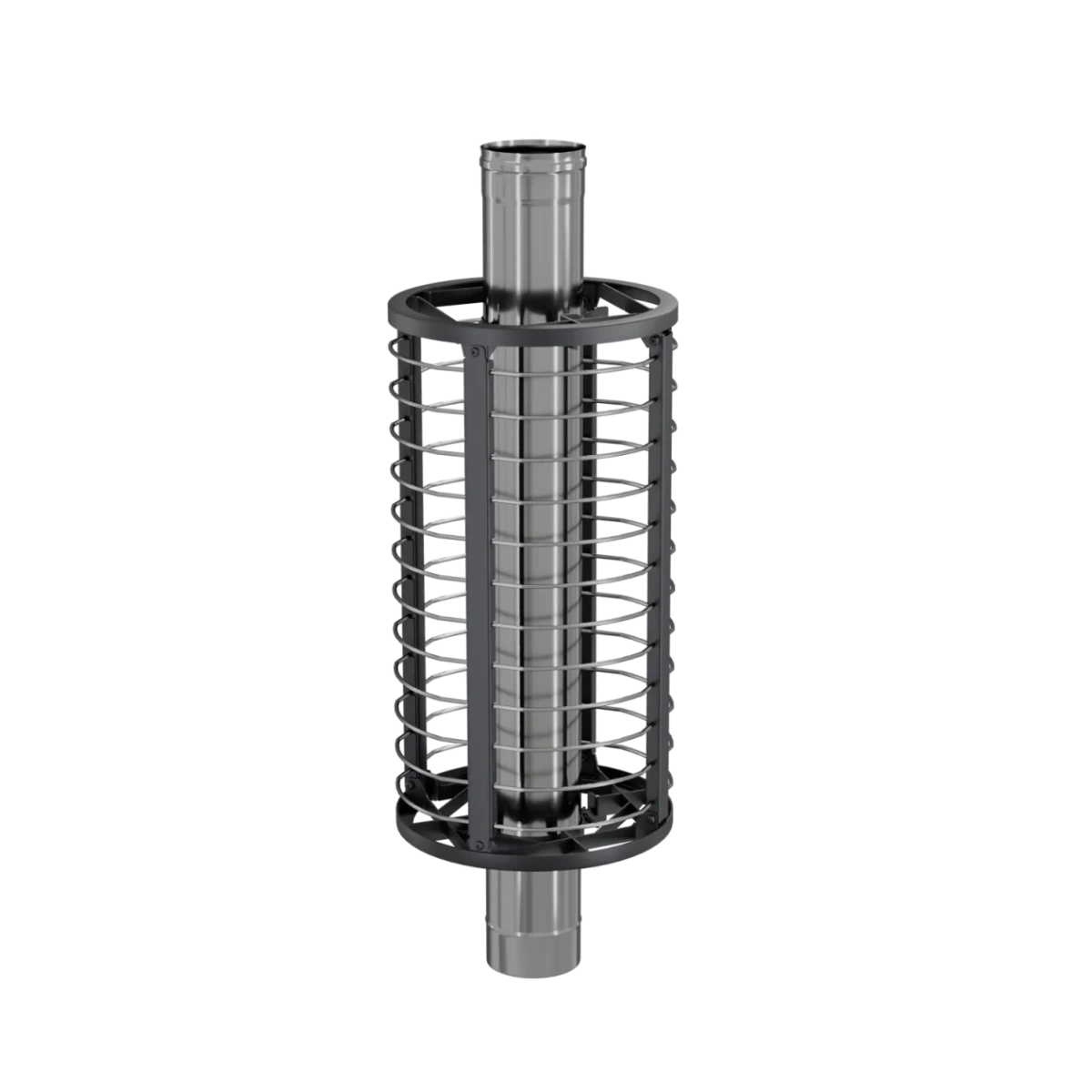 Сетка-каменка защищает от излучения, уменьшая поверхность открытой трубы, снимает тепло с ее стенок и направляет его на прогрев камней.