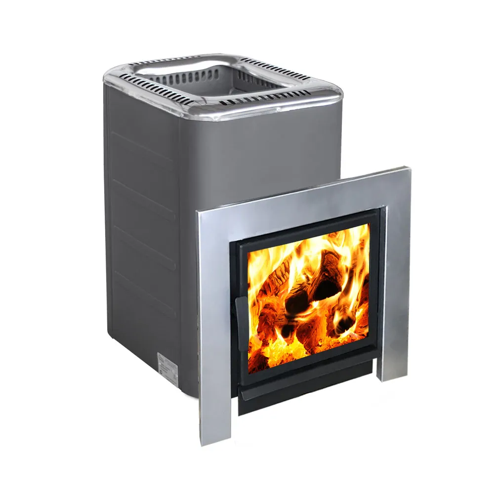 Печь рассчитана на установку в парилке с выходом топки в смежное помещение. Топочная дверка с большим панорамным стеклом.