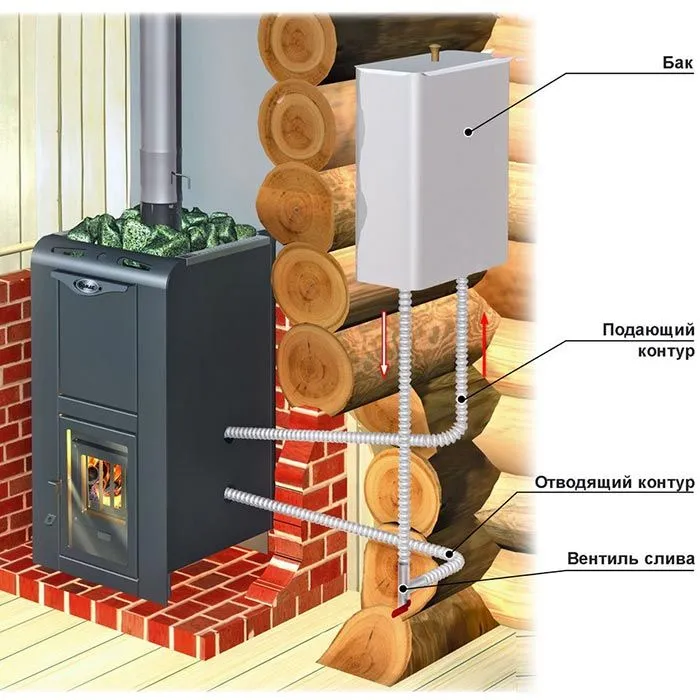 Теплообменник предназначен для нагрева воды в выносном баке за счет естественной циркуляции. Удобен, когда бак для горячей воды необходимо разместить в смежном помещении бани (мойке). Также теплообменник можно установить и в отопительную печь, приспособленную для этих целей с последующим подключением к водяной системе отопления или баку для нагрева воды. Устанавливается внутри топки банной или отопительной печи на одну из стенок.